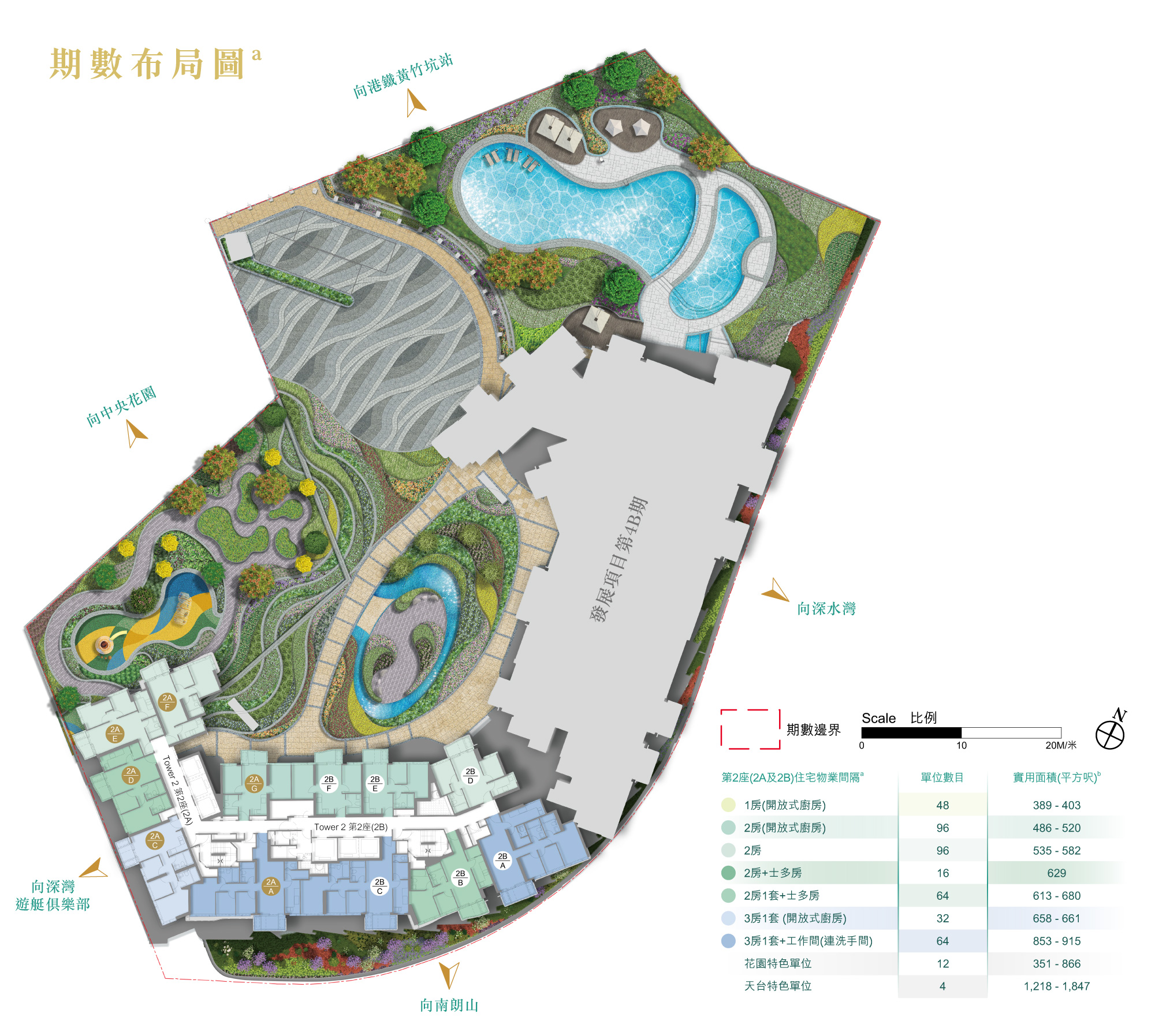 1. 此布局圖所顯示之期數住宅大樓樓面平面圖適用於第2座(2A及2B) 7樓至23樓所有單位,並未顯示附表所列之所有戶型或個別戶型之所有布局類型。此布局圖中所顯示之期數會所及其他設施適用於期數平台層之會所及其他設施之布局。2. 每個住宅物業的實用面積及在構成住宅物業的一部分的範圍內的露台、工作平台及陽台(如有)的樓面面積,是按照《一手住宅物業銷售條例》(第621章)第8條計算得出的。在構成住宅物業的一部分的範圍內的其他指明項目(如有)的面積(不計算入實用面積),是按照《一手住宅物業銷售條例》附表2第2部計算得出的。以上所列之住宅物業實用面積(包括露台、工作平台及陽台(如有)之樓面面積)是以平方呎列明,均以1平方米=10.764平方呎換算,並以四捨五入至整數平方呎。詳情請參閱售樓說明書。3. 此布局圖按照期數的最新經批准的建築圖則擬備,並非按照比例繪畫及經電腦修飾及簡化處理,亦可能未有顯示期數內的其他建築物及/或設施。此布局圖所顯示之設計、顏色、布局、用料、裝置、裝修物料、設備、植物、園景、設施、家具、擺設、燈飾、物件等未必會在期數落成後或其附近出現。賣方保留權利不時改動期數的建築圖則及其他圖則,期數設計以相關政府部門最終批准之圖則為準。此布局圖並不構成亦不得被詮釋成賣方就期數或其任何部份作出任何不論明示或隱含之要約、陳述、承諾或保證(不論是否有關景觀)。準買家切勿依賴此布局圖作任何用途或目的。賣方建議準買家參閱售樓說明書,以了解期數的資料。賣方亦建議準買家到有關發展地盤作實地考察,以對該發展地盤、其景觀、周邊地區環境及附近的公共設施有較佳了解。請參閱售樓說明書。4. 第2座(2A及2B)住宅單位樓層由5樓至43樓,不設13樓、14樓、24樓及34樓,25樓為庇護層。 5. 會所各區域及康樂設施的名稱僅作推廣之用,將不會在建築圖則、主公契、副公契、臨時買賣合約、買賣合約、轉讓契或其他業權契據或法律文件中顯示,有關名稱亦可能在期數落成時或其後有所改變。賣方就此並不作出亦不得被詮釋成作出任何不論明示或隱含之要約、陳述、承諾或保證。會所之資料僅供參考,賣方保留權利不時變更、修改和更改會所及康樂設施的間隔、設計、布局、名稱及用途。會所及/或康樂設施的落成日期以屋宇署、地政總署及/或其他相關政府部門之最終批核為準。部分康樂設施及/或服務的開放時間、使用或操作可能受制於相關法律、批地文件、主公契及副公契條款、實際狀況及天氣情況、會所守則及設施的使用守則及相關政府部門發出之同意書或許可証。會所及康樂設施可能需要另行收費方可使用,相關服務之細節及提供以管理公司及/或相關服務供應商之安排與決定為準。會所及康樂設施於期數入伙時未必能即時使用。6. 賣方建議準買家參閱售樓說明書,以了解期數的資料。 7. 關於期數的住宅物業的紓緩噪音措施之詳情,請參閱售樓說明書。